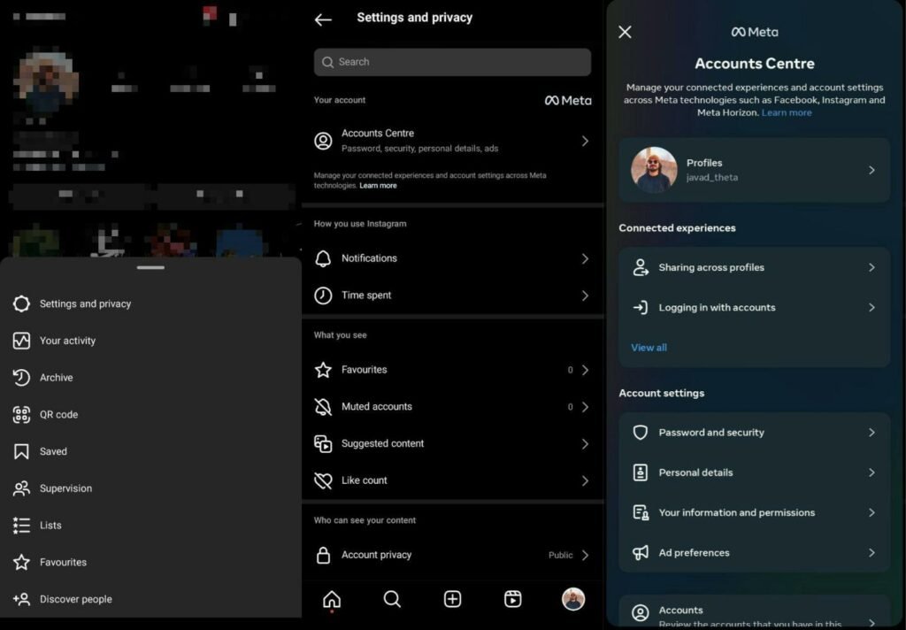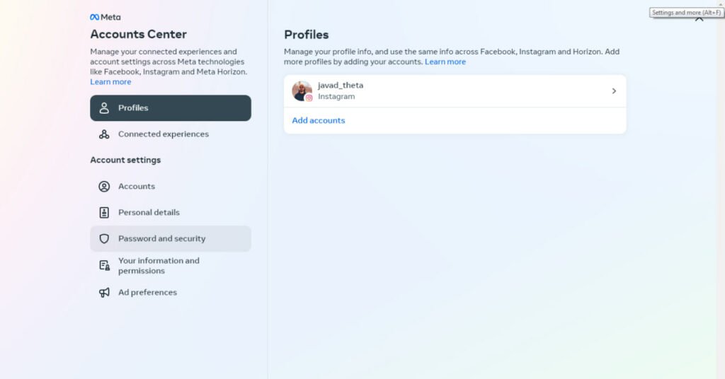 ۱٫ ابتدا به پروفایل خود بروید و از طریق تنظیمات وارد Accounts Center شوید.