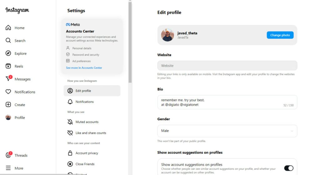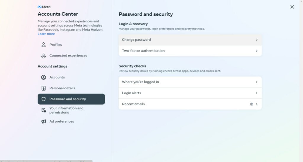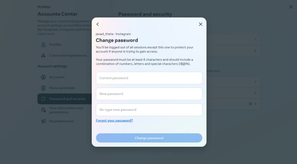 برای تغییر رمز عبور اینستاگرام از طریق کامپیوتر، وبسایت و گوگل نیز باید از طریق Accounts Center اقدام کنید. در مراحل زیر نحوه انجام این کار را آوردهایم.