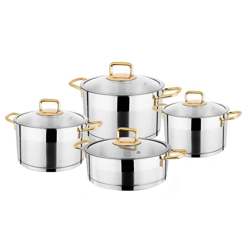 مبدا برند: ترکیه این مجموعه بی نظیر شامل سه عدد قابلمه در سایزهای 18 و 20 و 24 سانتی متر و یک عدد قابلمه سایز 24 با دیواره کوتاه که بتوان از آن به عنوان تابه نیز استفاده نمود تولید شده از استیل ضخیم ضد زنگ 18/10 قابلیت شستشو در ماشین ظرفشویی دارد قابل استفاده بر روی انواع اجاقها دسته های طلایی با رنگ ثابت کف ضخیم سه لایه از نوع کپسولی